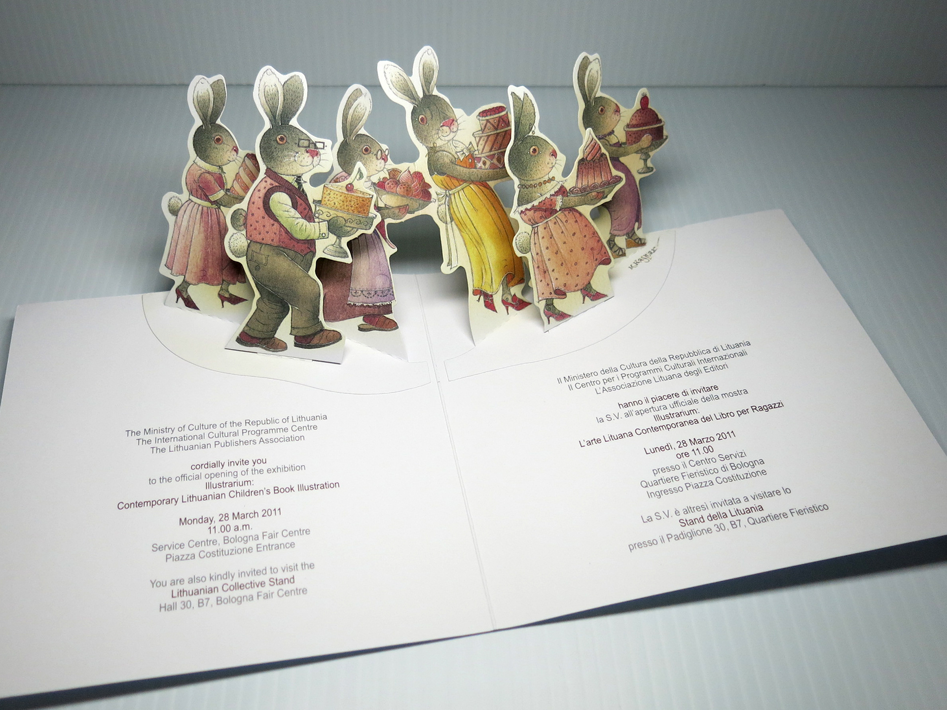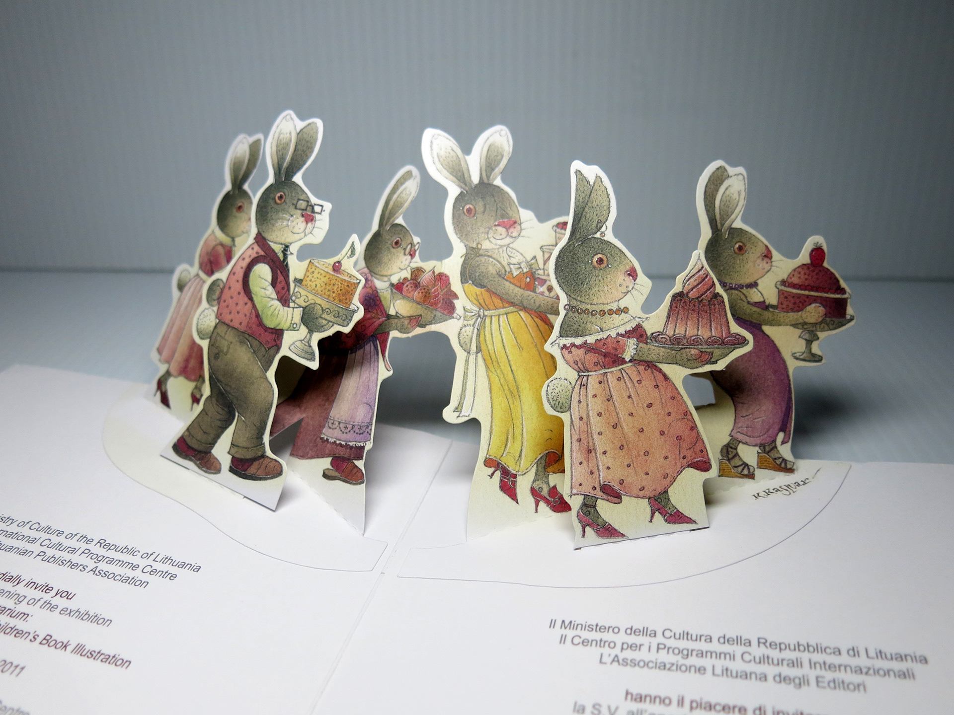 Simple V-fold invitation for a Bologna Book Fair. Concept, paper engineering and art manipulation by MM. Bunnies art by Kestutis Kasparavicius.