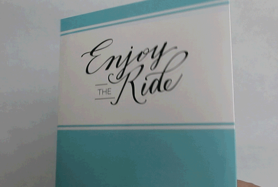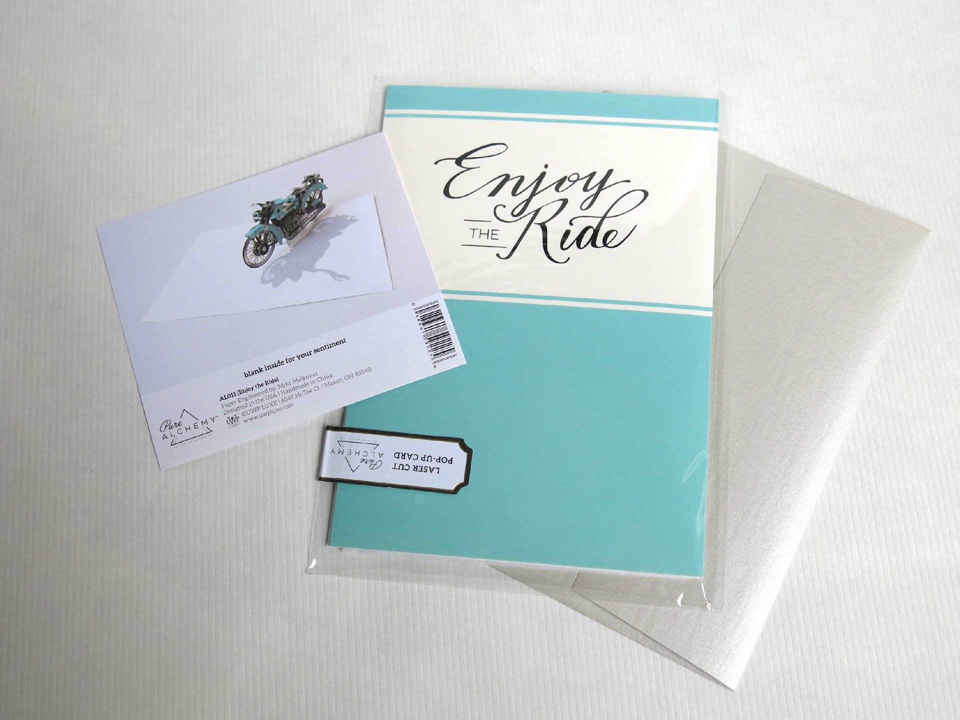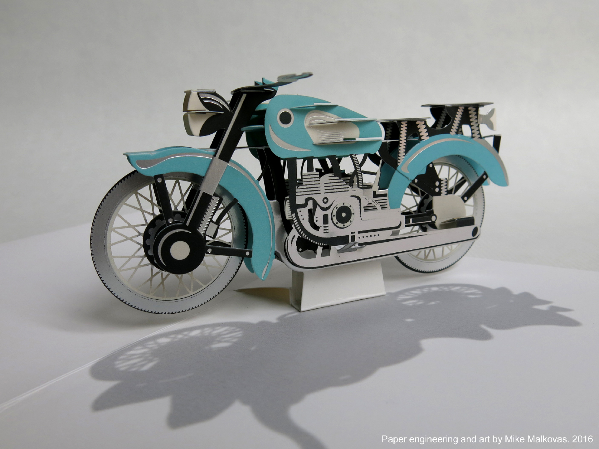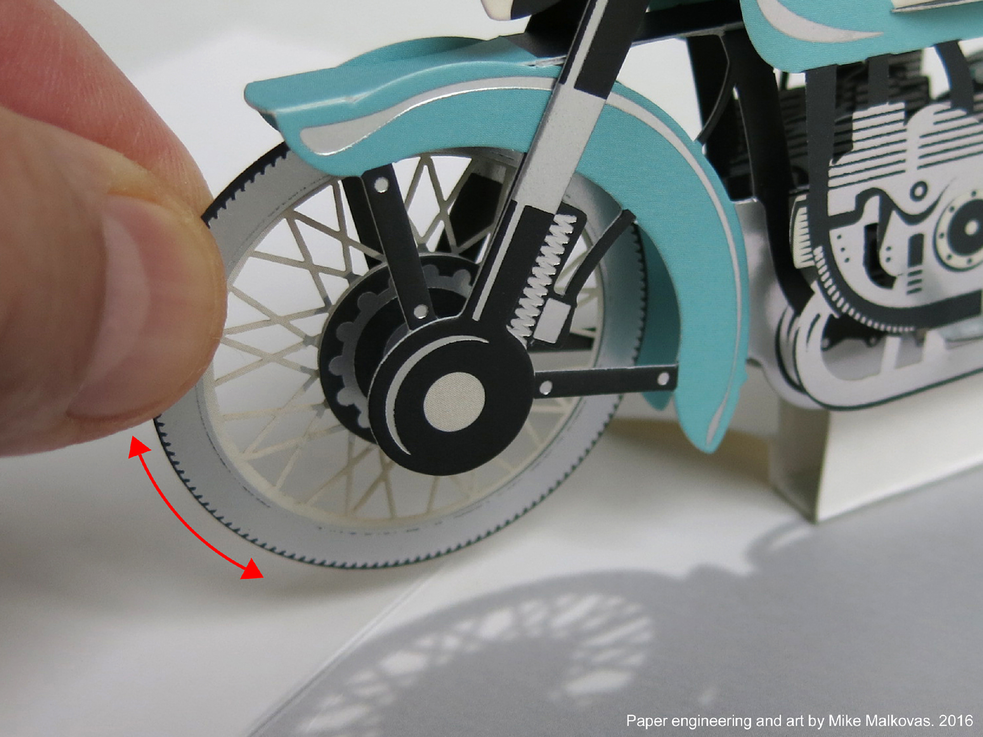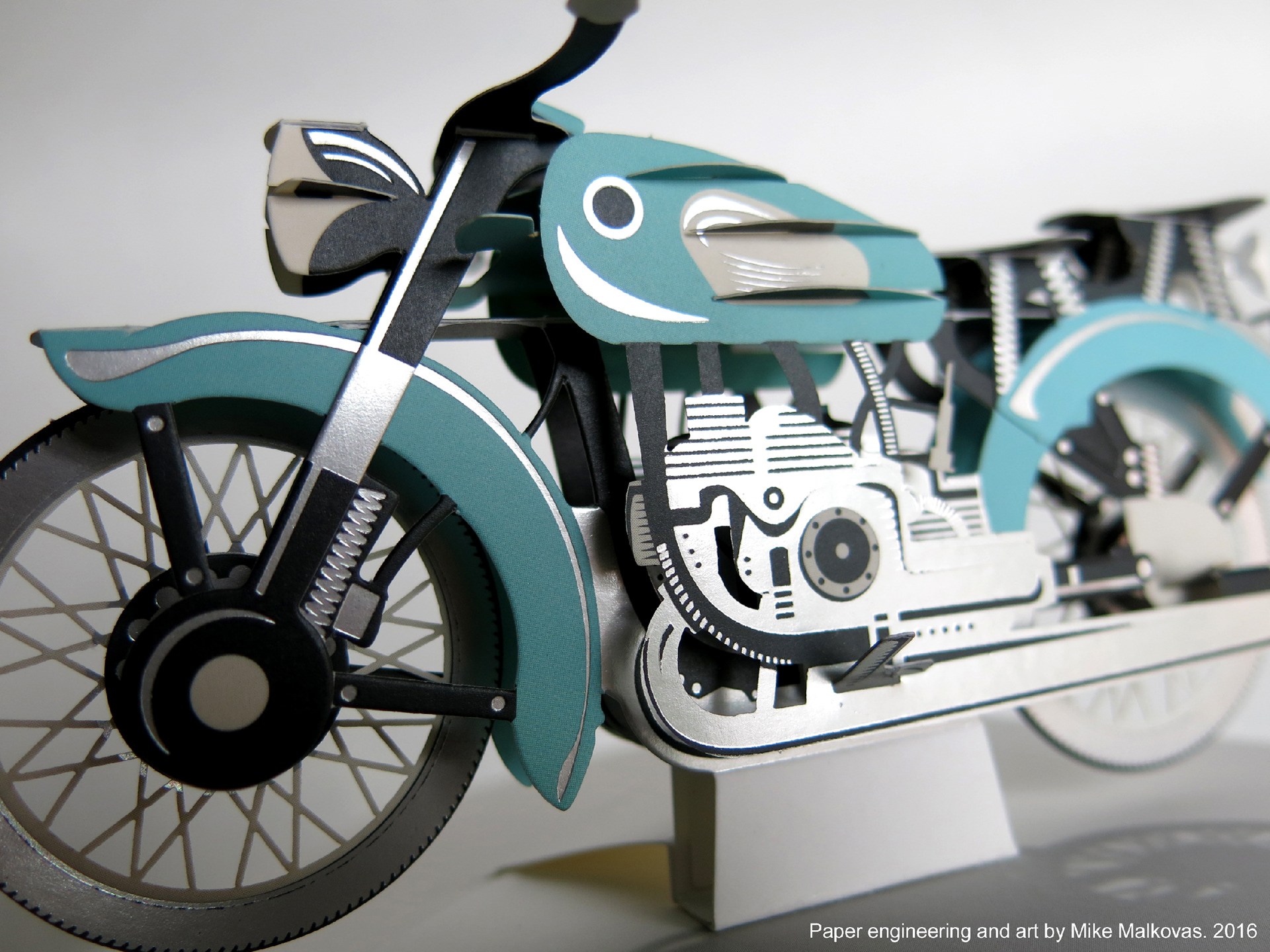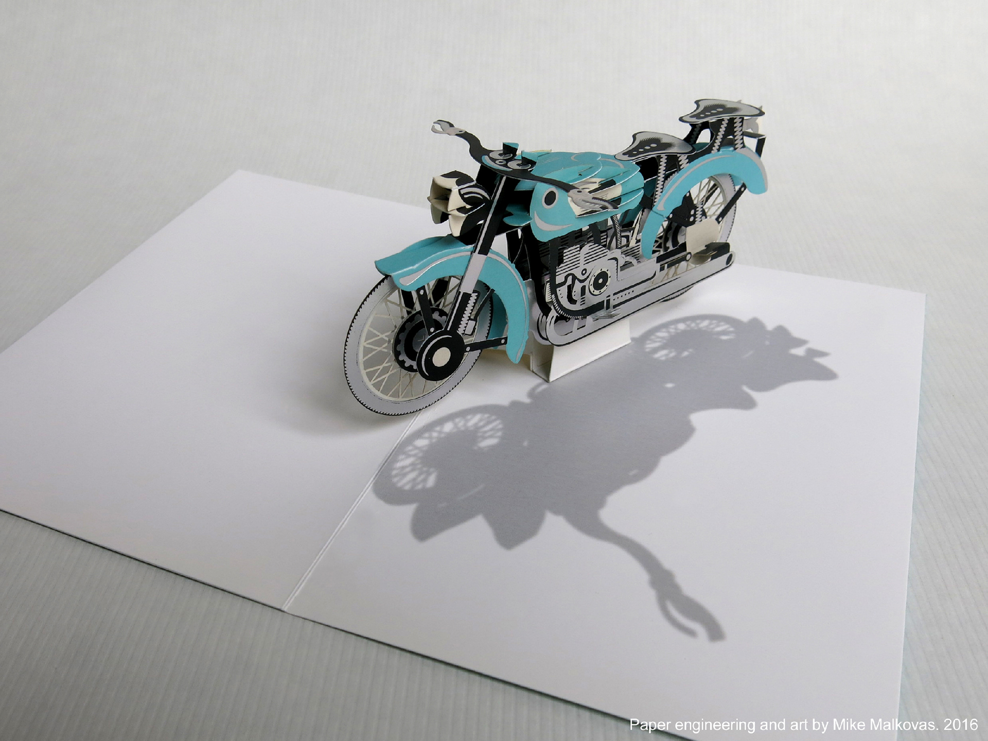 Pop-up card featuring stylized antique motorcycle with rotating wheels. Client: Up With Paper Luxe. Paper engineering and art by MM.