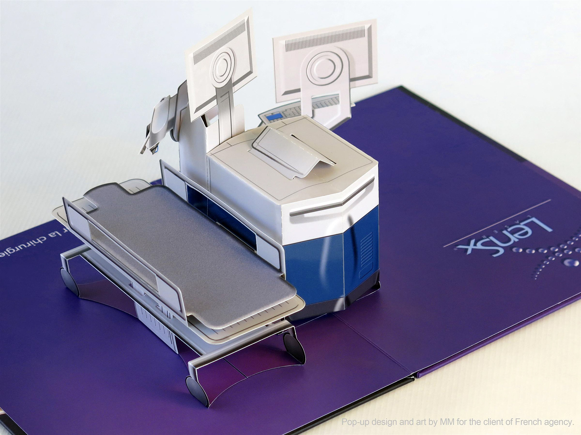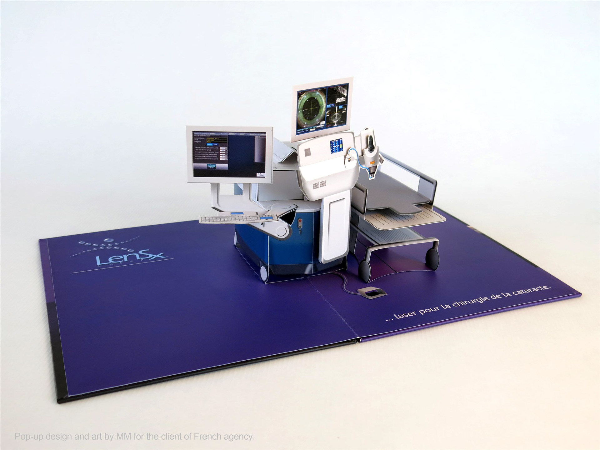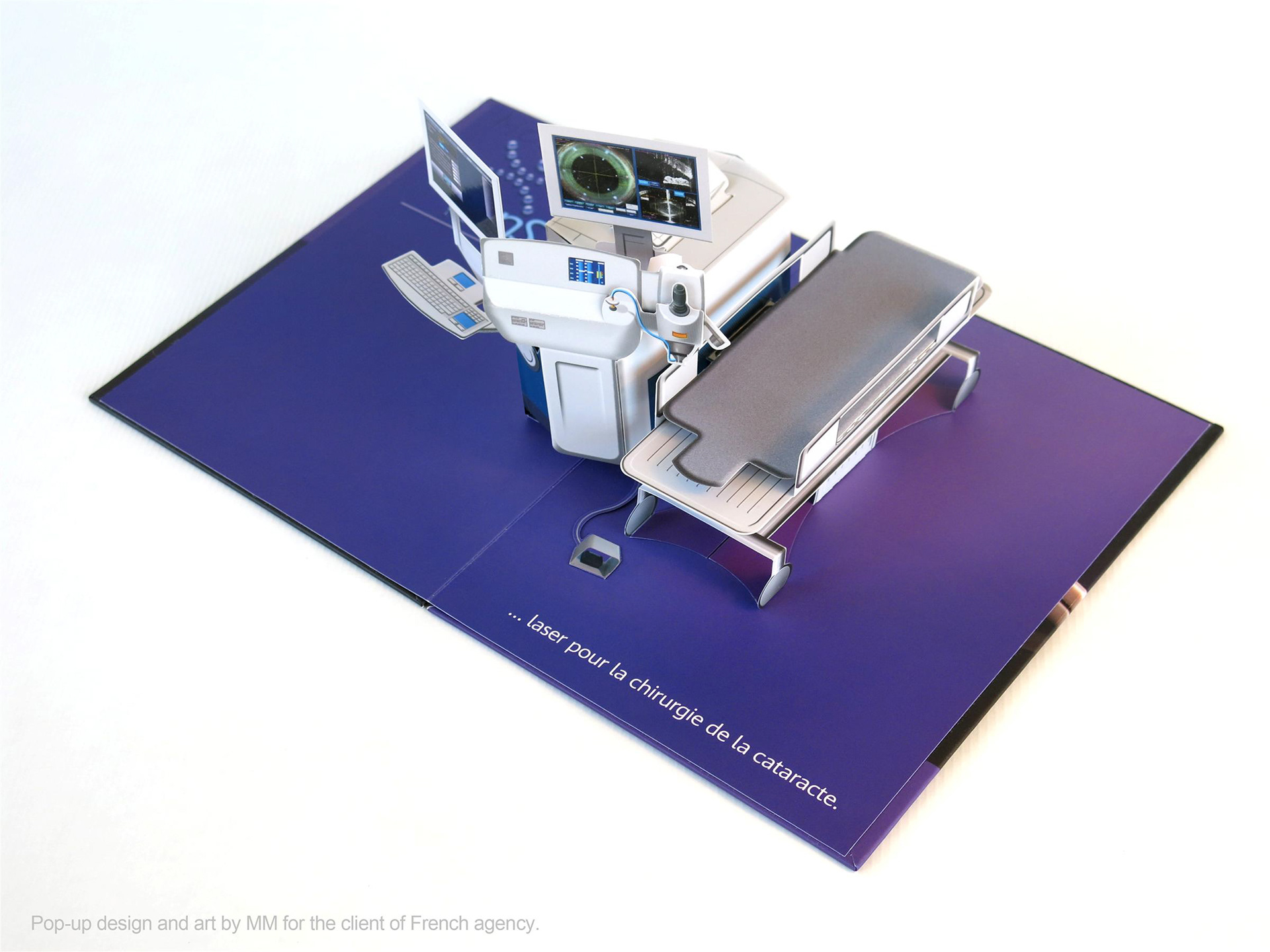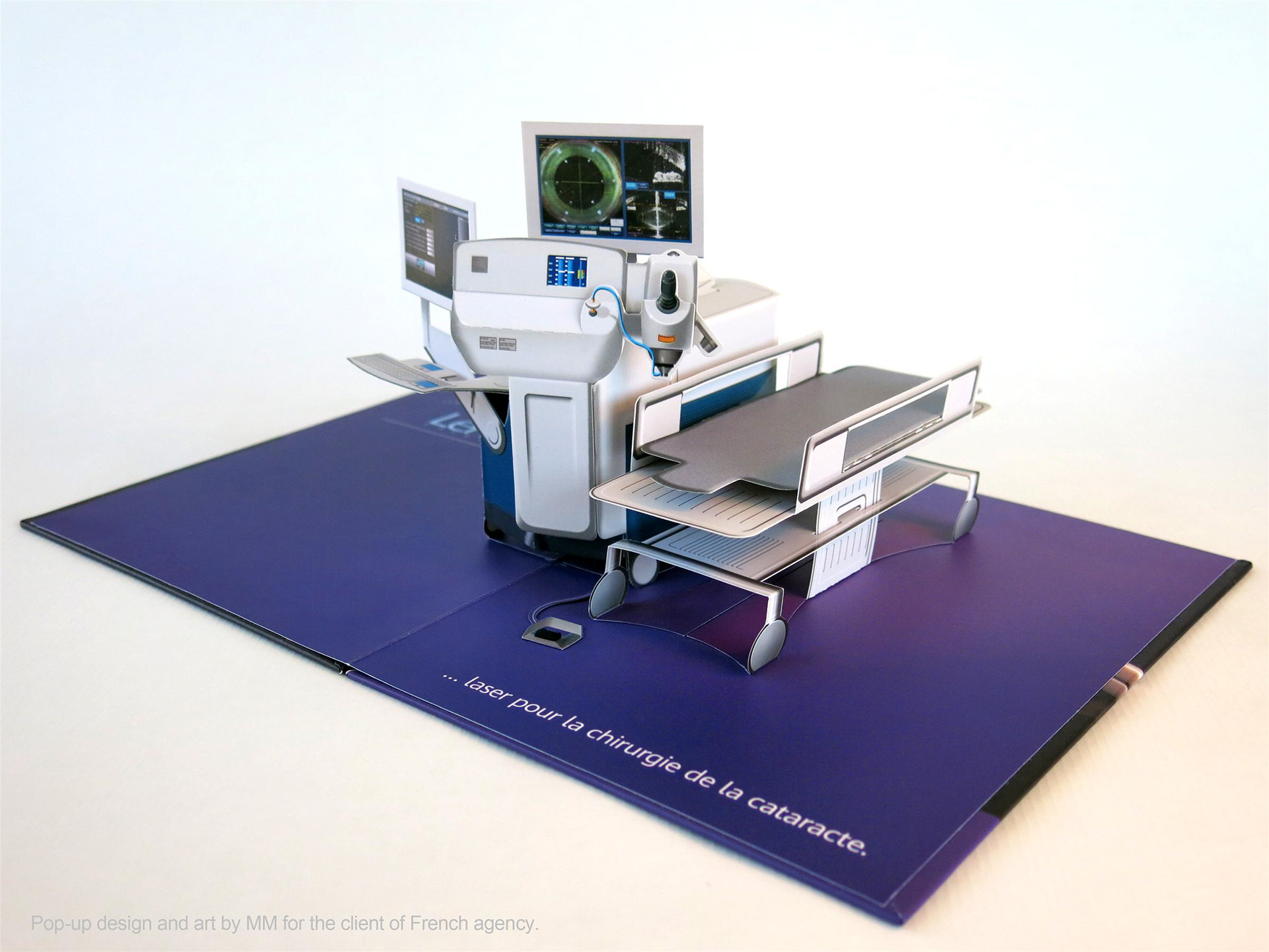 Pop-up of cataract surgery station designed for the client of French agency. Paper engineering and art of pop-up by MM. Cover art by client of French agency.